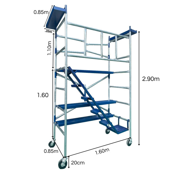 El ancho de 85 cm no es un dato casual; es el punto exacto que logra el equilibrio entre estabilidad, comodidad y practicidad. Gracias a esta medida, el andamio mantiene un área de trabajo segura y un centro de gravedad estable, cumpliendo con la regla de seguridad 2:1 en altura y base, lo que lo convierte en una solución confiable tanto en maniobra como en operación.