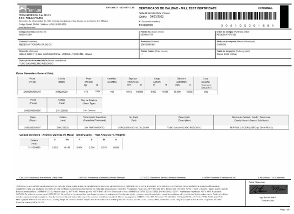 CERTIFICACIÓN DEL MATERIAL ENTREGADA POR EL PROVEEDOR DEL TUBO GALVANIZADO.