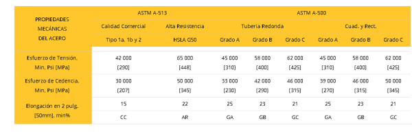 Norma: ASTM A513. A513 TIPO 1 EL TUBO SE UTILIZA PARA LOS MUEBLES, BASTIDORES DE ALMACENAMIENTO, COMPONENTES DE LA MÁQUINA, VALLAS Y MÁS. LA TUBERÍA INDUSTRIAL CUENTA CON UNA RESISTENCIA A LA TENSIÓN: MÍNIMO 42 KSI (290 MPA) (2,953 KG/CM2). LÍMITE DE FLUENCIA: MÍNIMO 30 KSI (205 MPA) (2,110 KG/CM2). SUS MÚLTIPLES PROPIEDADES COMO ALTA RESISTENCIA Y MALEABILIDAD, SE EMPLEA PARA LA REALIZACIÓN DE ESTRUCTURAS DE NAVES INDUSTRIALES, POZOS PROFUNDOS U OBRAS EN LA INDUSTRIA METAL MECÁNICA. OTRAS APLICACIONES LAS ENCONTRAMOS EN MUEBLES, AUTOPARTES, HERRERÍA, PORTONES, CIELOS RASOS, Y CONSTRUCCIÓN.